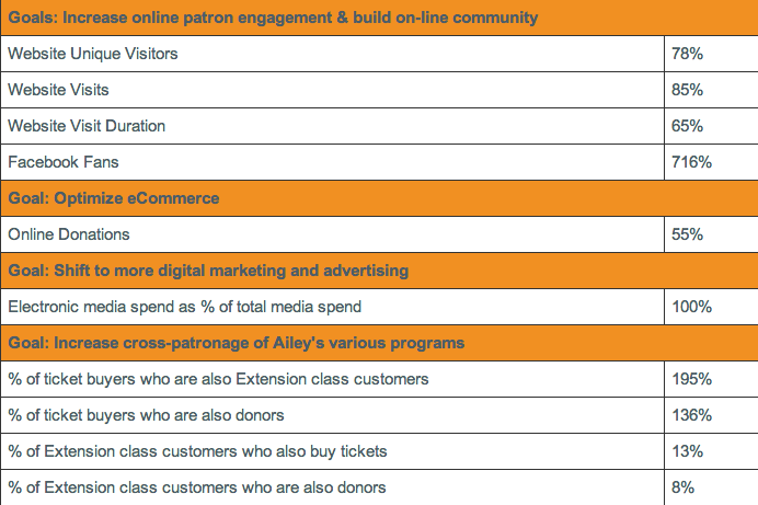 At the time the plan was implemented, Alvin Ailey created 34 different metrics to measure its goals. By the end of the four-year plan (2011), Alvin Ailey experienced a 716% increase in Facebook fans, a 136% increase in ticket buyers who are also donors, and a 55% increase in online donations. The chart below, from the Nonprofit Finance Fund, shows the percent change in evaluation metrics from the baseline (2007, pre-grant) to 2012.