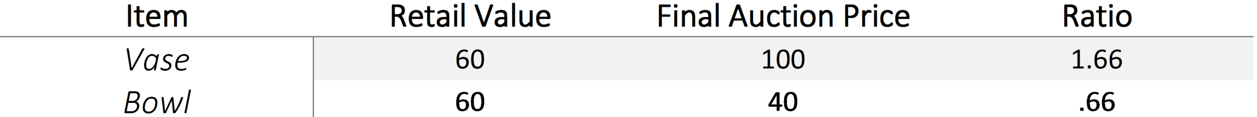 As an example, the chart above looks at two different fictional items. Each item has a retail value of $60 however the vase was sold for $100 and the bowl for $40. The ratio reflects this difference and demonstrates that there was higher competition for the vase, then for the bowl. (It is important to note that the starting price of each item for SCC was a set percentage of the retail value). Additionally, you can plot the retail value and the final auction price on a scatter plot as demonstrated below:
