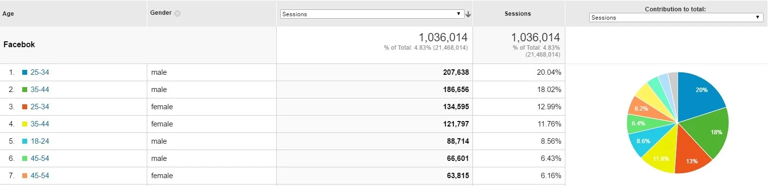 Comparing to the demographic information on Google Analytics, we can see that even though males aged between 18-24 consistently have a high reach and engagement rate on Facebook, the website sessions from that segment are relatively low. Male Facebook users aged between 35 - 44 have a lower reach and engagement rate than those of female Facebook users aged between 25 - 34, but they are much more likely to continue browsing the website than the younger female Facebook users.