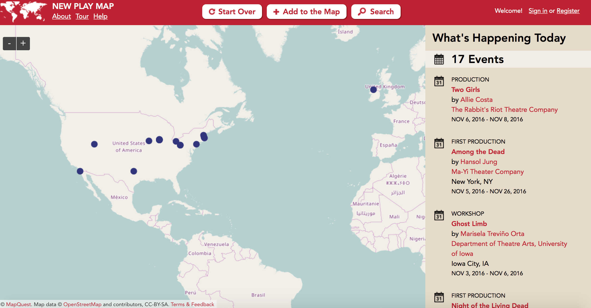 Howlround started forming the idea of the New Play Map in Fall 2009, based on a desire to visualize the infrastructure that exists across the theatre sector. With the National New Play Network’s cooperation and feedback, Howlround launched the first version in January 2011, and its fourth version is currently on their website.