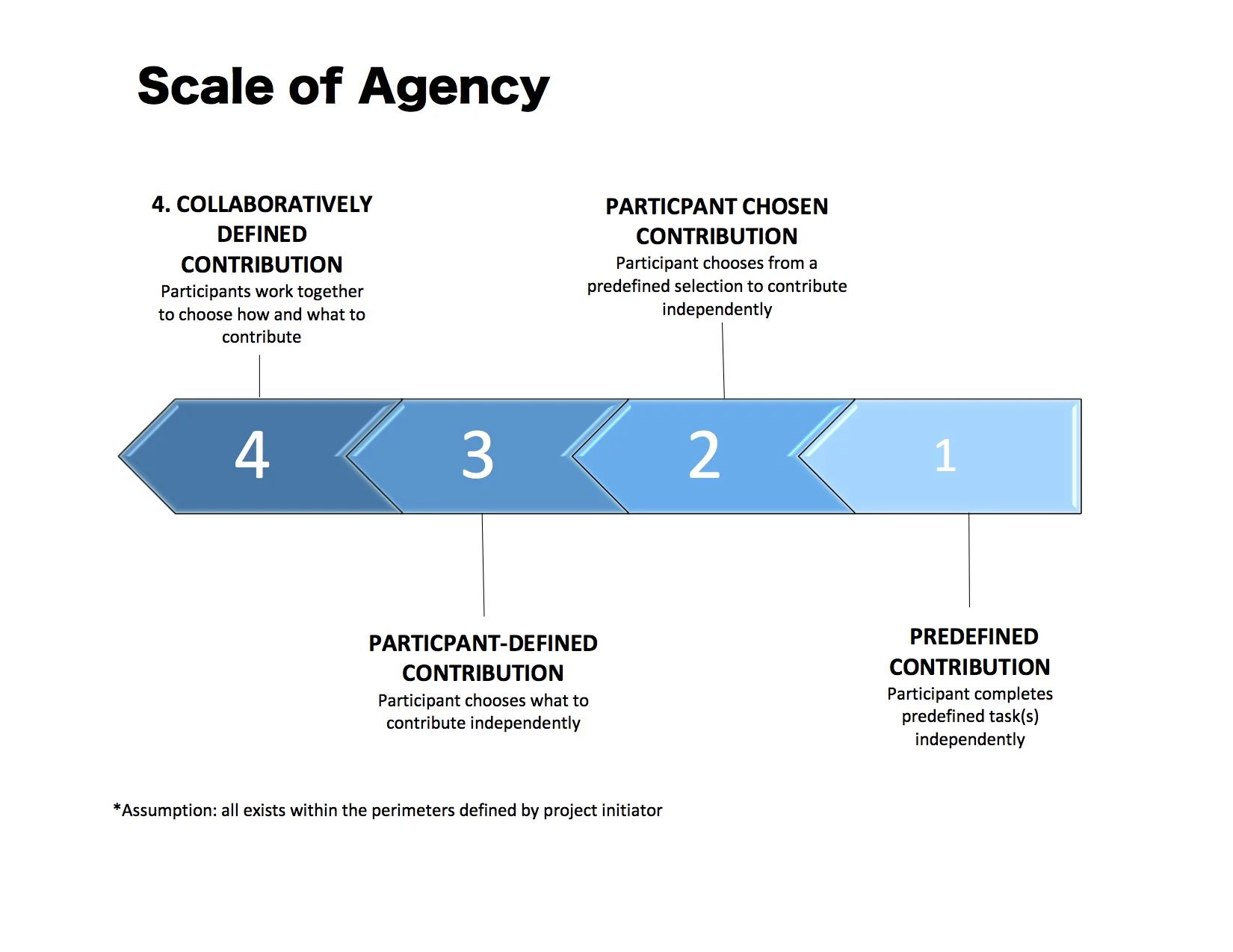 The research team reviewed crowdsourced digital art projects and developed two scales upon which to position projects. In the review of digital art projects it became evident that the level of centralization and control in each project varied. Furthermore, there was an inherent difference in the product of the project depending on the control mechanisms established by the project initiator. Thus, a preliminary scale was designed to capture the range of centralization in the case projects (Figure 1). In examining the varied levels of centralization in the case projects, a secondary difference emerged in the types of participant contributions that impacted the level of engagement or facility a participant had in the project. Literature on audience engagement and the evolution of participatory art informed a separate scale of participant agency (Figure 2).