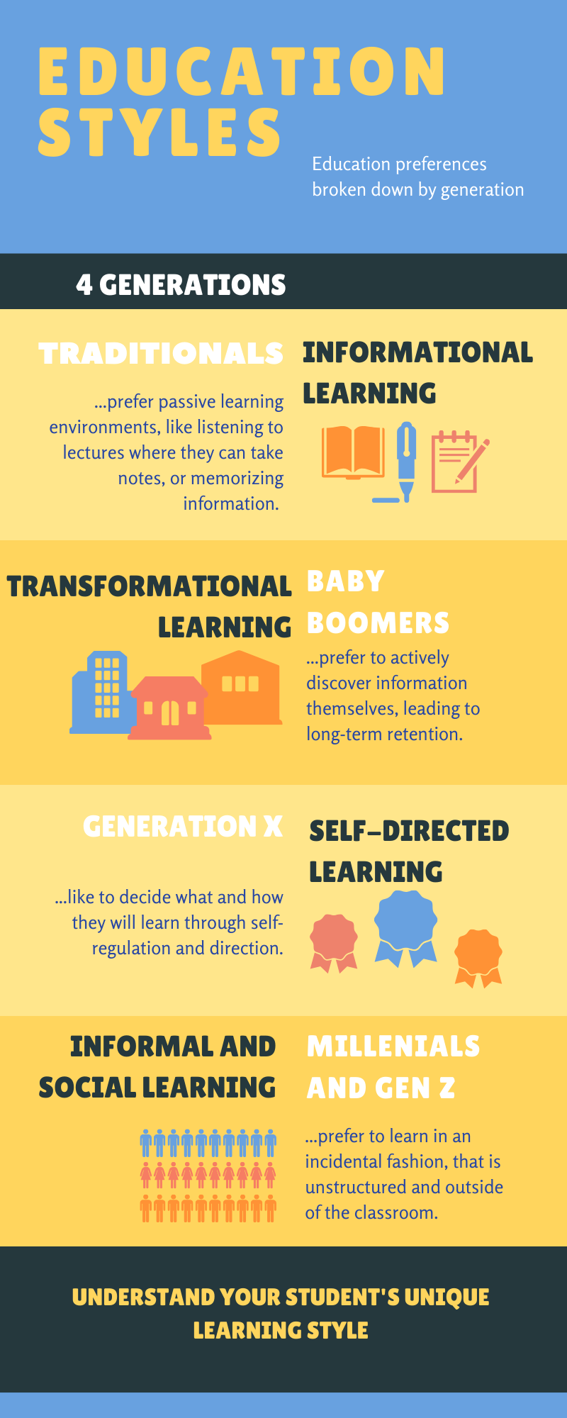 These different generations lean toward varying learning styles. Figure 2 illustrates the common learning styles by generation.