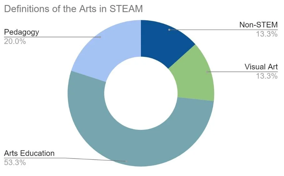 A lack of clarity about the definition of the arts still persists. I conducted a (less-extensive) literature review which showed similar disparities (see Figure 1). Arts education was the most commonly used definition, but there still exists a lack of clarity on what the arts in STEAM are supposed to mean. Without clear messaging on this topic, implementation is difficult. Teachers already do not feel equipped to implement STEAM in their classroom, how can they be expected to implement it if there is not a unified definition of what it means to incorporate the arts in with the STEM subjects?