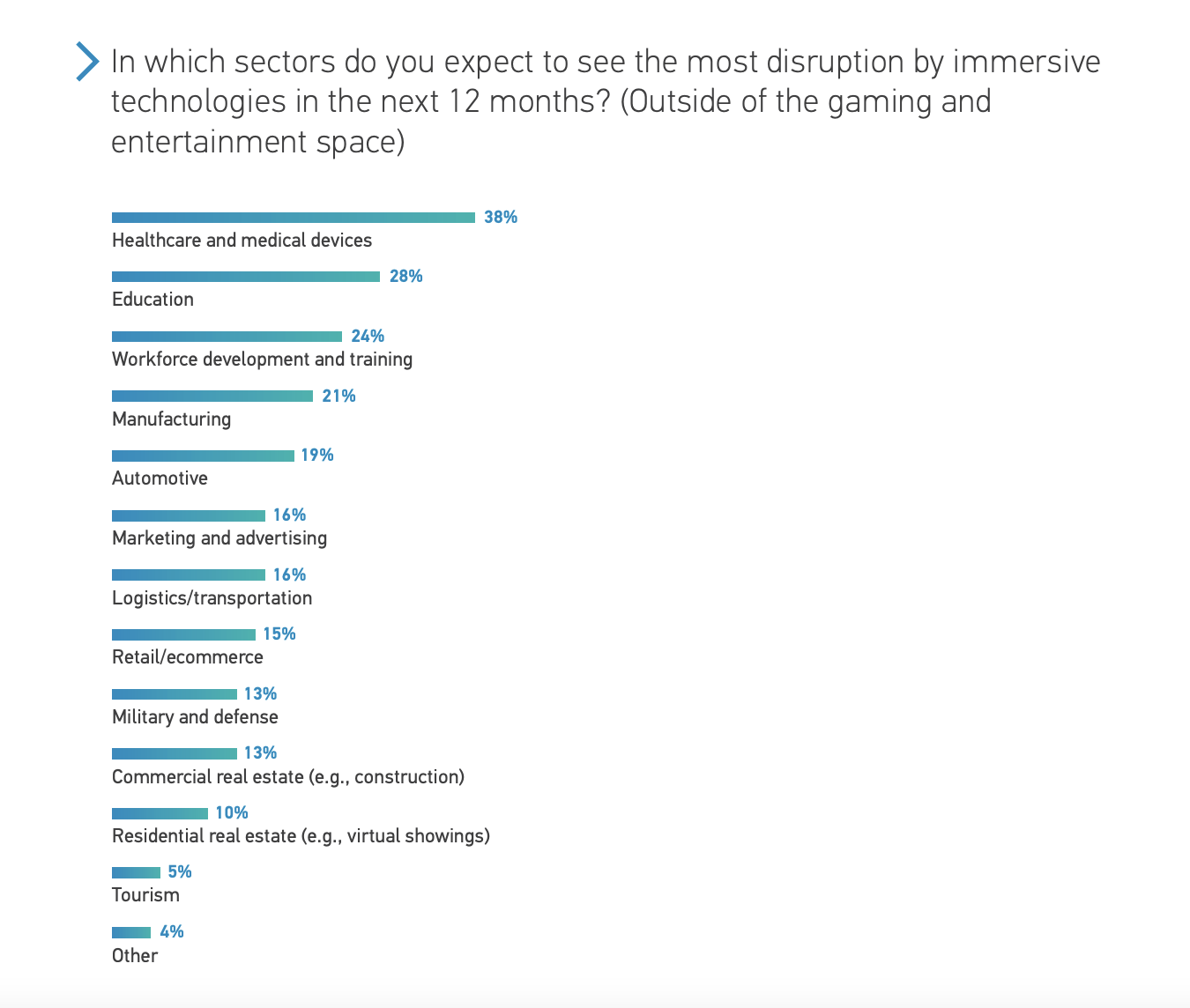 A visualization showing how VR development is disrupting health and education. Source: 2020 Augmented and Virtual Reality Survey Report.