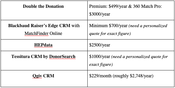 The majority of these software providers listed above all have similar service offerings, the greatest exception being the size of their databases, their ages, their flexibility, and their prices. They all offer embedded tools for a nonprofit’s website, and they all offer a more expensive option that follows up with the donor/CSR software provider on the nonprofits behalf automatically to “chase” and keep track of the donations. The more expensive option is where the software does everything autonomously and is useful because nonprofits can let the software do the work and they don’t need to employ someone to reach out to third parties on their behalf. The CRMs of companies such as Blackbaud and Tessitura function more as management tools for the business, and a nonprofit cannot just utilize their tools (MatchFinder Online and DonorSearch) without switching over entirely to their exclusive CRM system. For this, Blackbaud and Tessitura both recommend Double the Donation and are actually partners with the company. There is a slight discount when you buy both at the same time.