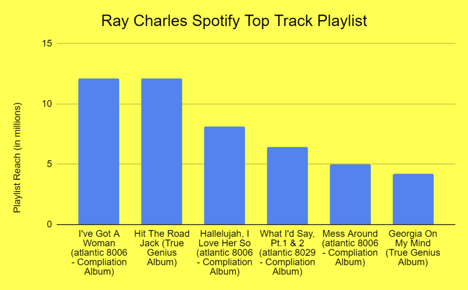 Market Size: His foundation generates around $3 million a year in revenue with $41 million in assets (“Ray Charles Net Worth,” 2022). His current fanbase (based on social media) has approximately 4.2 million fans; and (based on streaming data ) he has over 7 million streams.