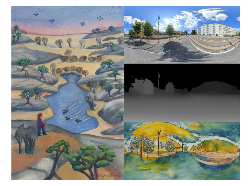 Panorama of predicted location(top right), Depth map (middle right), art panorama using depth map and CLIP prompt (bottom right). Artwork: Lepistö, P. “Kolme vesilintua metsälammella”. Courtesy of the HAM collection. Scource: AI Art Curation