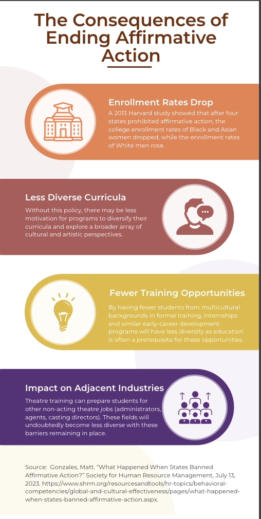 Affirmative action policies led schools to adopt more inclusive and diverse curricula that reflect a wide range of theatrical traditions, styles, and voices. Yet, the federal government banned affirmative action in June 2023, leaving universities unable to consider a student's race in their admissions decision. This makes efforts like race-conscious recruiting impossible.