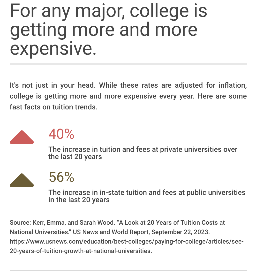 Kerr, Emma, and Sarah Wood. “A Look at 20 Years of Tuition Costs at National Universities.” US News and World Report, September 22, 2023. https://www.usnews.com/education/best-colleges/paying-for-college/articles/see-20-years-of-tuition-growth-at-national-universities.