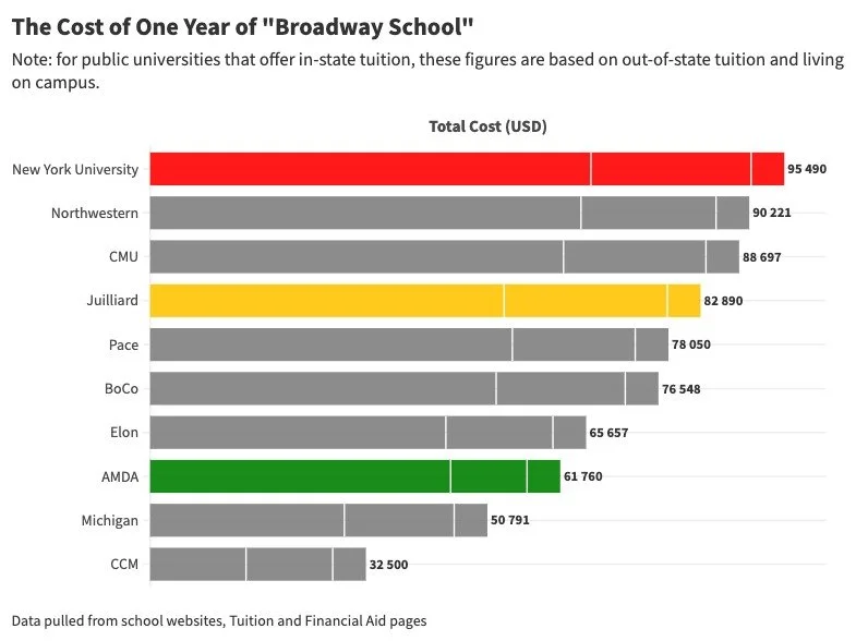 Playbill, a theatre magazine perhaps most famous for its iconic programs that are featured in many Instagram stories, releases an annual report of the Top 10 Colleges and Universities Represented on Broadway from the previous year. The messaging of the best theatre schools is reinforced each year around June when Playbill releases another article on where that year’s Tony Award-winning actors, directors, and designers went to college. Many high school students, hoping to make it in the business, start their college search here - but what is the true cost of a musical theatre degree from one of these institutions?