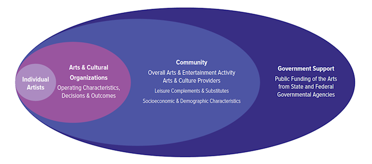 Arts Vibrancy is calculated under the assumption that arts organizations are tied into the social fabric of their communities. SMU calls the relationship between arts organizations and their communities “symbiotic”. Figure 1 depicts the interdependent relationship in which an arts ecosystem flourishes.