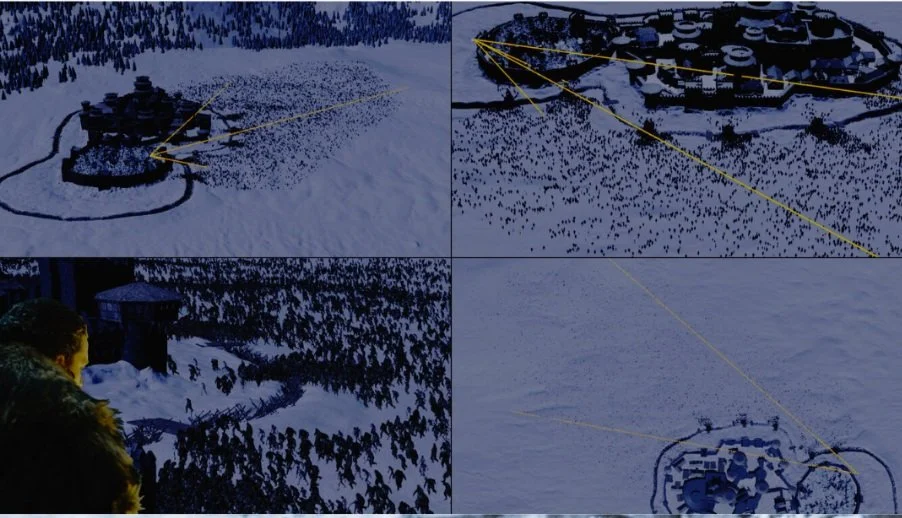 As has been established, however, Massive Software operates at the level of individual, artificially intelligent agents. Take, for instance, a wight storming the castle in the Battle of Winterfell. In Game of Thrones, wights are somewhat more complex than the average zombie as they possess an evident understanding of their surroundings and a loosely logical decision-making process when faced with changes in environment. As visual effects supervisor Martin Hill explained of wight consciousness: “they’re all hungry to get inside [the walls of Winterfell], but not t the extent where they’ll pull another wight down to get in front of him … they’re not trying to get one-up over the wight next to them.” Using the advancements to Massive that had deployed since its initial launch with The Lord of the Rings, each wight was provided a field of view, which allowed it to react realistically to its surroundings. Each of the artificially intelligent wight’s perceptions of their point of view were then fed into a motion capture library, which “triggers different motion cycles or different parts of the capture library” that allow the agents to freely and logically scramble through the environment. Teams of stunt-people, physical performers, and motion capture artists were combined with a database of pre-existing wight movement in order to “enhance” the motion of the artificially intelligent agents. In the end, the network of motion capture possibilities open to the agent was “at the point of not really being countable” and 30,000 of these environmentally conscious, intelligent wights ultimately descended upon the walls of Winterfell.