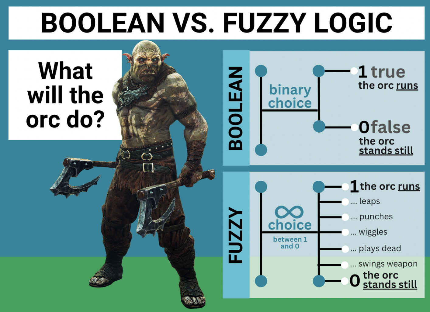 First implemented with The Lord of the Rings trilogy, Massive Software posits that the maintained believability of their AI-generated animation relies largely on the concept of “fuzzy logic.” Derived from mathematical theory and research, in the context of Massive, fuzzy logic provides a “way to create naturalistic and subtle behavior” that human viewers will interpret as realistic and powerful, even if there is no precise or logical information provided regarding its binary truth or reality. Fuzzy logic and the mathematical fuzzy set theory rose in popularity in the 1970s and 1980s particularly in Eastern Europe and the Soviet Union. The concept challenges classical, “Aristotelian, bivalent, [Cartesian, or Boolean] logic” that decision making and perception rely on “defined [boundaries] between two classes.” Fuzzy logic invites–as researcher Lotfi A. Zadeh puts it– “a progression from binarization to graduation, from binarism to pluralism, from black and white to shades of gray.” This shift calls on the human cognitive ability to understand classes of objects based on classes that may have unsharp (or, fuzzy) boundaries “with degrees of membership.” Fuzzy logic, then, allows the swarm of AI-generated orcs in The Battle of Helm’s Deep to move from what would have been considered uncanny or deeply unrealistic under traditional binary Cartesian logic to something just “sharp” enough to be cognitively classified as realistic or believable under fuzzy logic.
