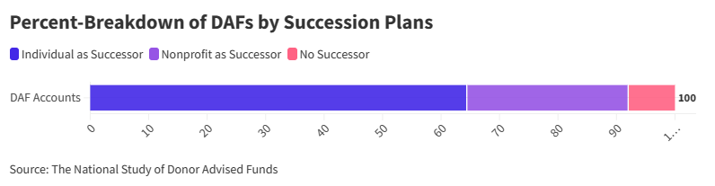 The over-indexing of baby boomers and older generations toward DAF giving are significant looking forward as well: 92% of funds have a succession plan in place, with 30% designating a nonprofit organization as the recipient of their remaining fund balance upon death. This signals a potentially significant transfer of wealth, or at least control such wealth, over time as founding advisors age-out.