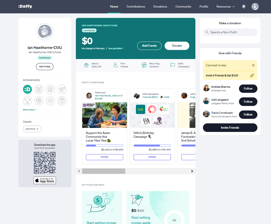 Daffy has already been referenced as the ‘LinkedIn for giving’, providing a public charitable profile highlighting recent giving activity, as well as the ability to pin favorite charities to user’s profiles to further highlight values and direct giving by other users.
