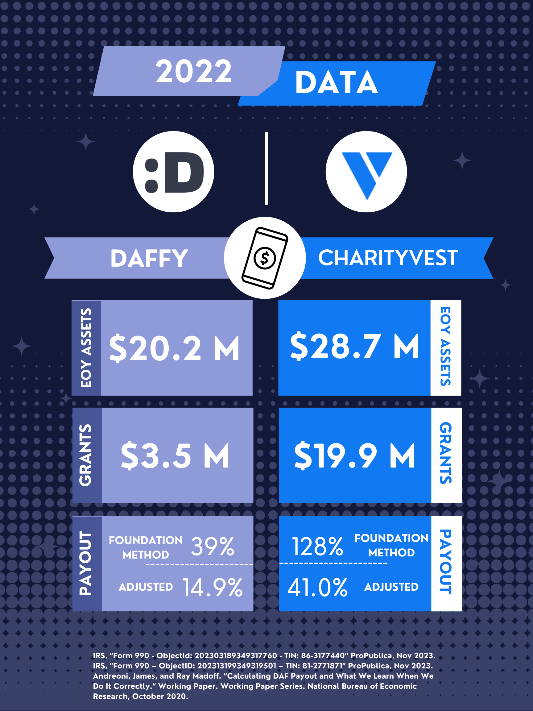 Both boast industry-leading payout rates as well, calculated using either the Foundation Center Method or more conservatively adjusted methods provided by economists like Andreoni. In 2022 Daffy’s adjusted rate was still almost 15%, still three times the minimum required distribution for foundations. CharityVest’s adjusted rate in 2022 stood at a staggering 41%.