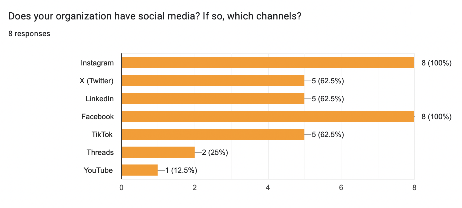 To better understand what the museum professionals are saying about their organization’s use of GenAI in their marketing strategy, the survey began with baseline questions about the organization’s social media channels and usage. Overall, all 8 of the organizations have Instagram and Facebook, while 5 of them have X, LinkedIn, and TikTok. Of respondents who identified use of “Other” channels, 2 specified using Threads and 1 using YouTube.