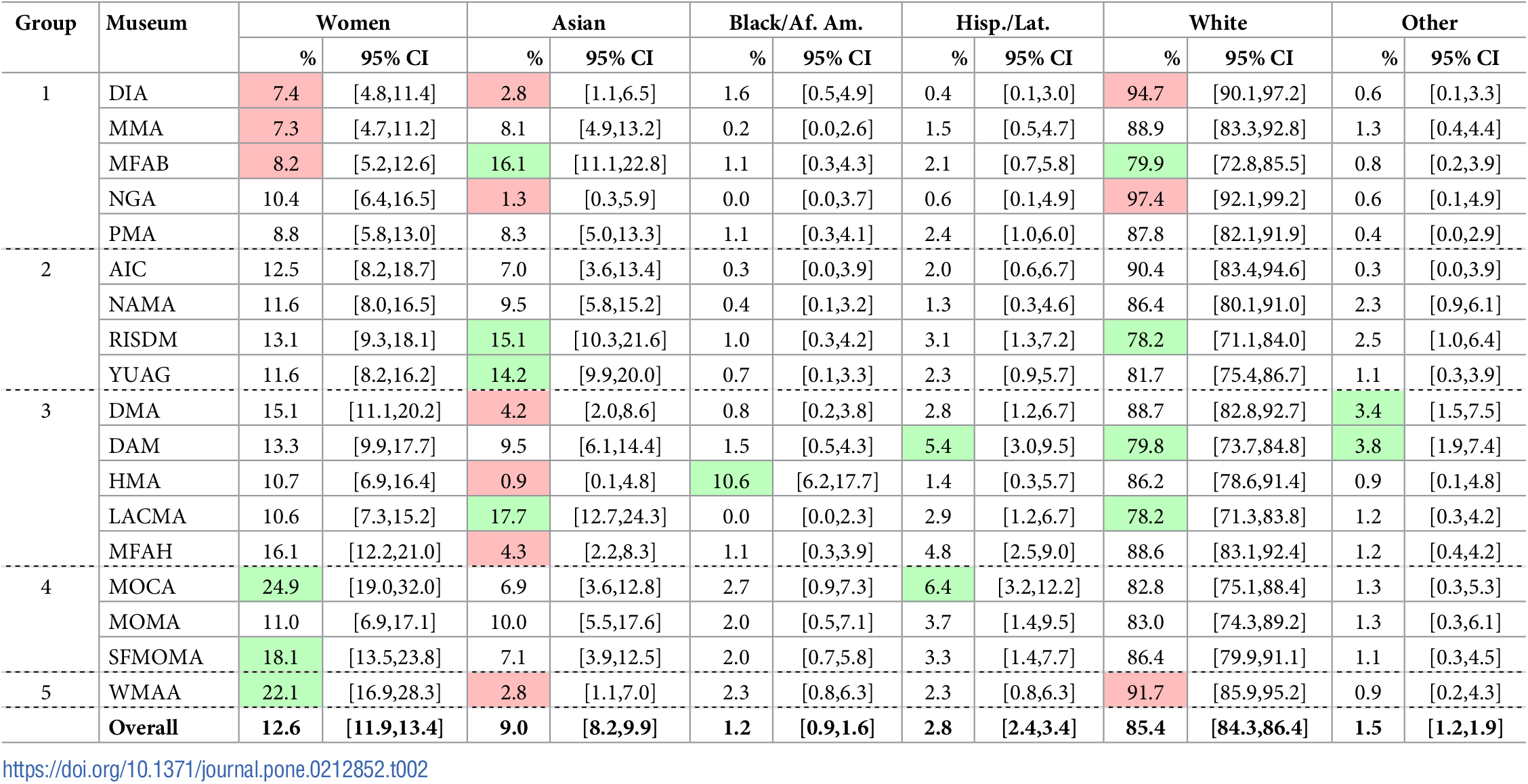 Figure 1: Results of data scraped from 18 major US museums separated into categories regarding race and gender. Source: Public Library of Science