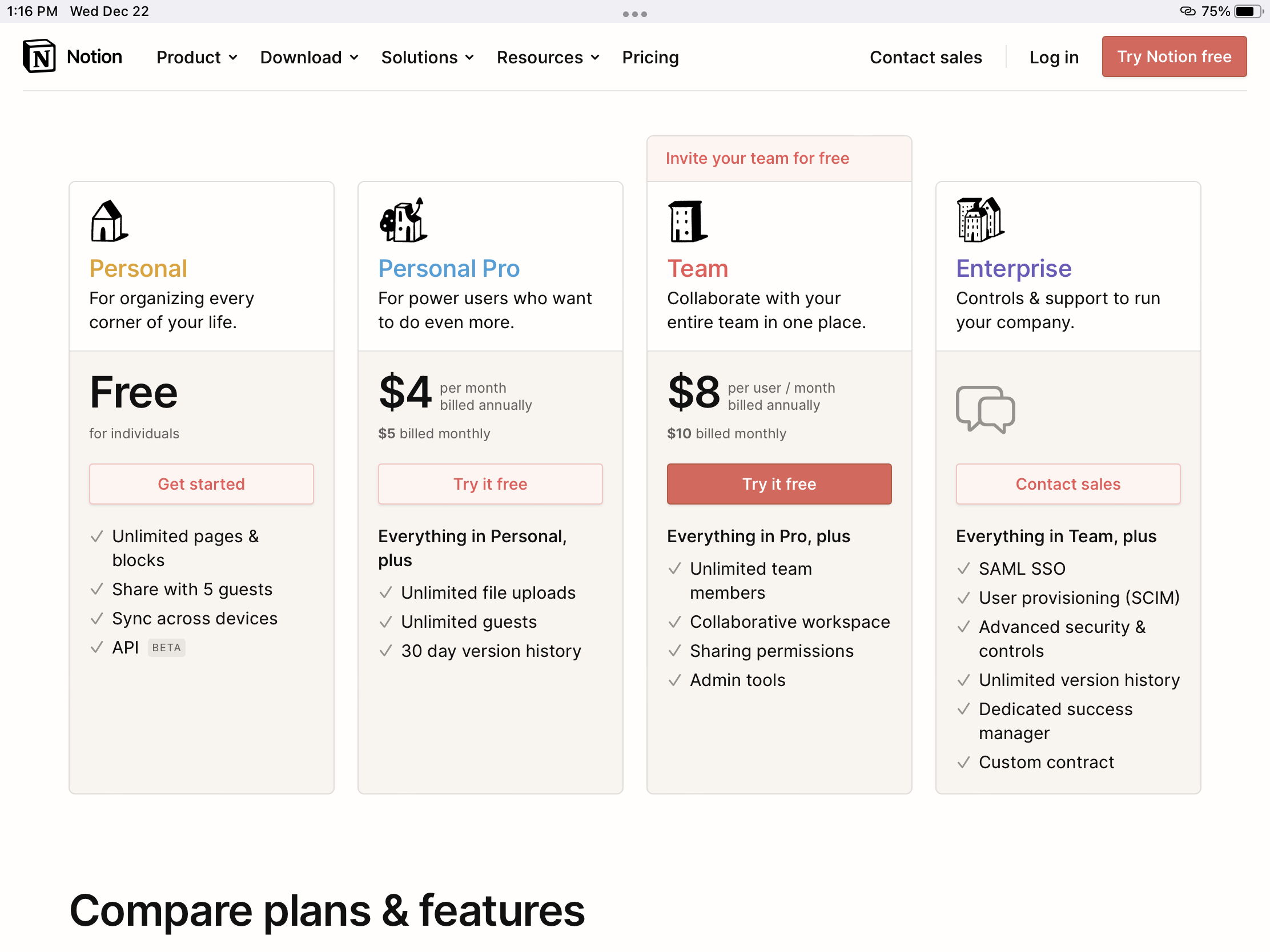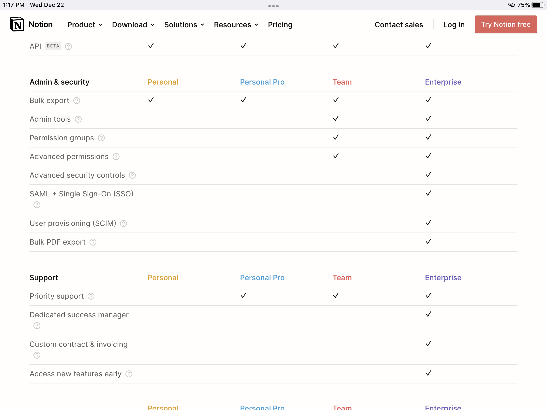 Figure 5. Admin, Security and Support provided by pricing tier. Source: Notion.so