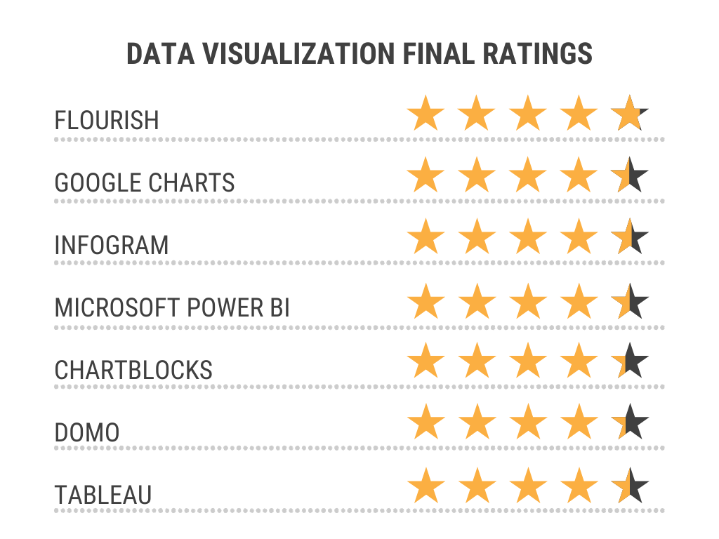 The following seven tools were selected after an extensive search of popular, highly recommended, and best-suited programs for nonprofits and small businesses. They will be critiqued based on general pros and cons, ease of use, cost, the types of graphs able to be made, compatibility with other devices, and average customer ratings aggregated from popular data visualization review websites and blogs, including Software Advice, SaaSworthy, Capterra, and others.