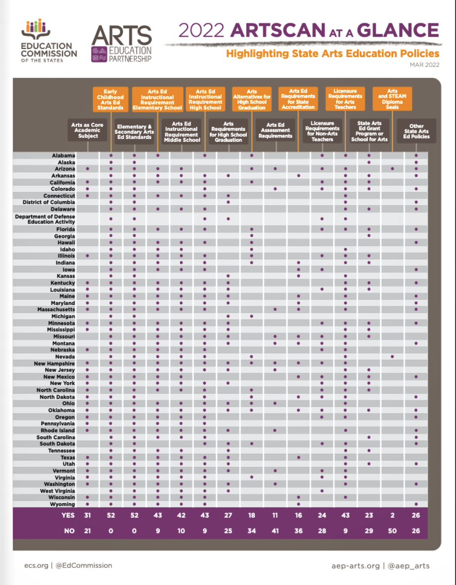 "ArtScan at a Glance." Arts Education Partnership. March 29, 2021. https://www.ecs.org/artscan-at-a-glance/.