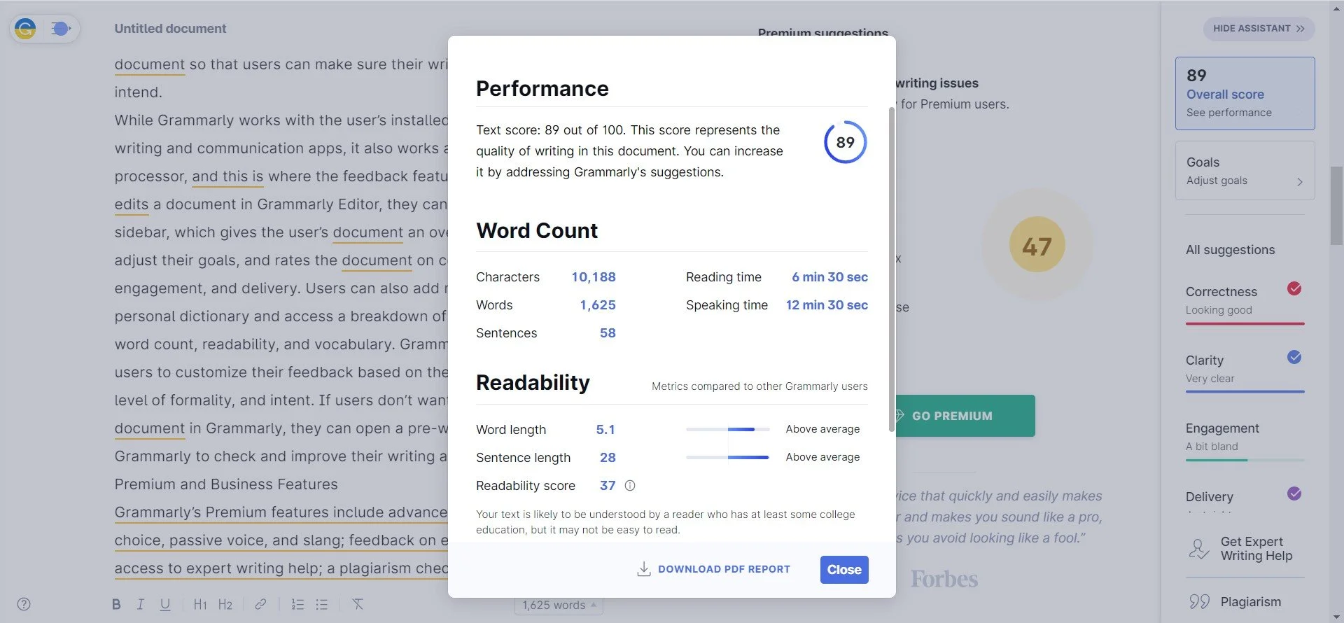 Grammarly’s main strength is the detailed feedback it provides. Instead of telling you a change should be made, it explains why so that you can make an informed decision about whether to accept or reject the suggestion. The overall writing score breakdown available in the Grammarly Editor provides useful feedback about the speaking and reading time of a document, which is useful if a user is writing something to present verbally. It also estimates the reading grade level of the document so that the user can ensure their writing is accessible to their intended audience. The Grammarly Editor’s overall score feature and its ability to rate your work almost gamifies the writing process —i t’s fun to tweak and improve a document little by little to achieve a higher score!