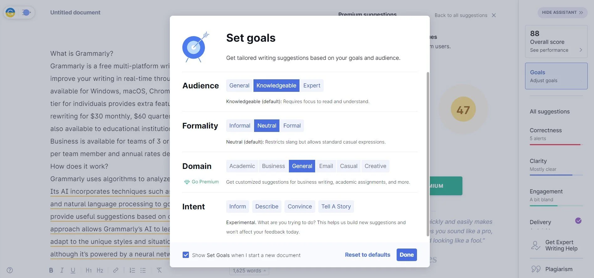 The ability to use Goals to set domain preferences such as business, academic, casual, email, or creative (the free version only allows a general domain).