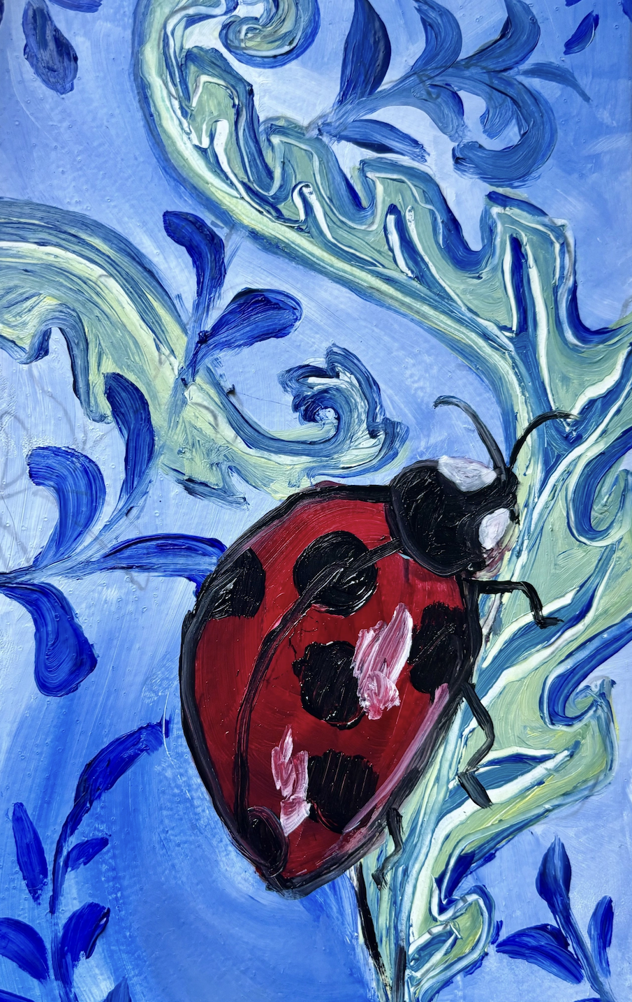 Artist's Note: I created this painting depicting a ladybug and a leaf to test each tool's shading, blending, and line-producing capabilities. The artwork incorporates both realistic and abstract elements, serving as a means to examine the VR's capacity to handle both styles.